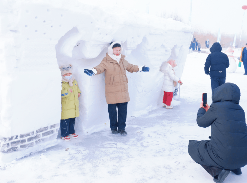 创意雪雕展区陈列着团场职工精心创作的10件雪雕作品,栩栩如生的“龙马呈祥”、古朴雄浑的城墙楼阁等造型,成为游客争相拍照打卡的亮点。