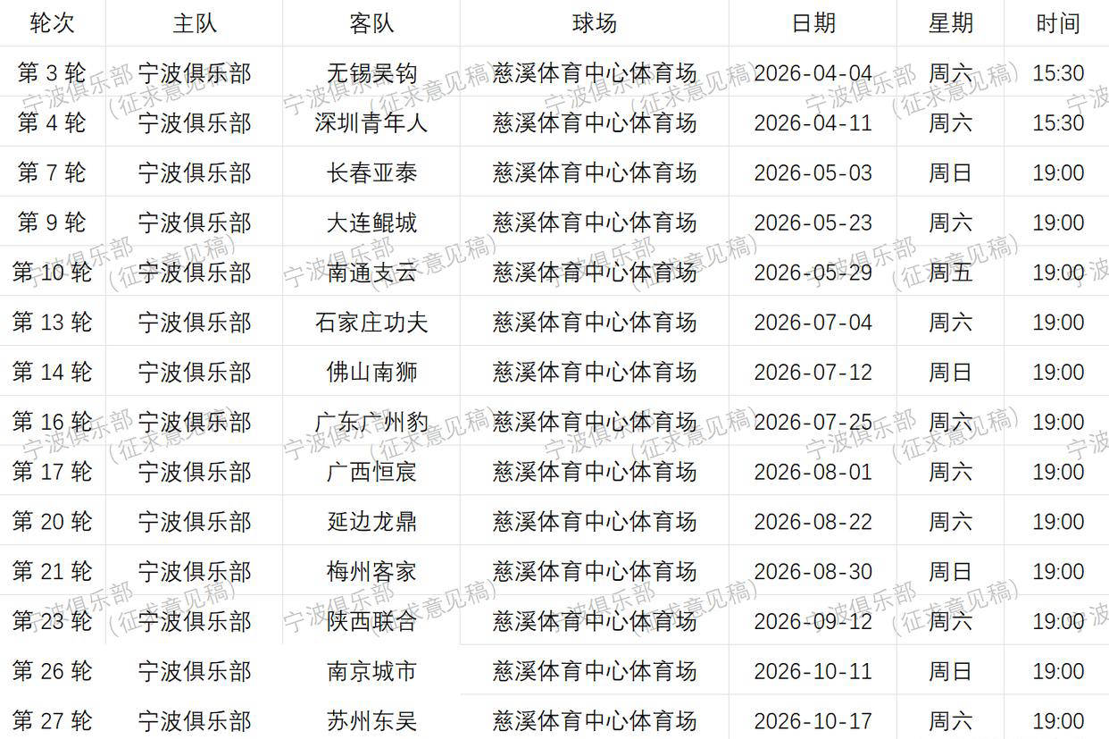 足球直播,世界杯直播,体育直播,足球比分,世界杯,足球赛事,足球,波胆,角球,串关,大小球2026赛季中甲联赛即将拉开帷幕,近日有球迷率先曝光了宁波FC的部分赛程安排。虽然目前这份主场比赛日程还只是意见稿,仍存在调整的可能性,但整体脉络基本明朗。从公布的赛程来看,宁波FC在开赛初期将连续进行两场客场大战,随后才迎来首个主场比赛,这无疑对球队是巨大的考验。