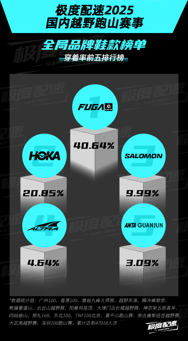 选购跑山鞋,适配国内复杂山地、抓地稳、支撑强是核心标准。国产品牌围绕这些实用功能持续研发,产品力大幅提升。从赛场实际穿着也能直观印证专业认可度:凯乐石FUGA在国内赛事穿着率超40%,凭借出色的抓地与稳定性能,成为从新手到资深跑者都公认的放心选择。