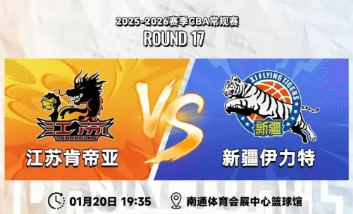 虎扑01月19日讯 据江苏男篮官方发文,1月20日19:35,2025-26赛季CBA常规赛第十七轮,江苏肯帝亚将迎来转战南通赛区的首场比赛,再战新疆伊力特。