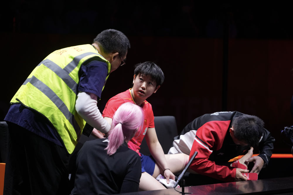 孙颖莎(中)在2025年世界乒乓球职业大联盟(WTT)总决赛女子单打半决赛中接受治疗。新华社发(吕小炜 摄)
