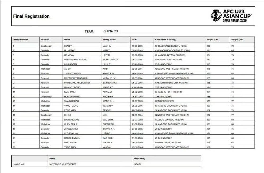 足球直播,世界杯直播,体育直播,足球比分,世界杯,足球赛事,足球,波胆,角球,串关,大小球2026年U23亚洲杯中国队23人参赛名单4日公布,王钰栋、蒯纪闻、拜合拉木、胡荷韬等球员在列,门将李昊入选。