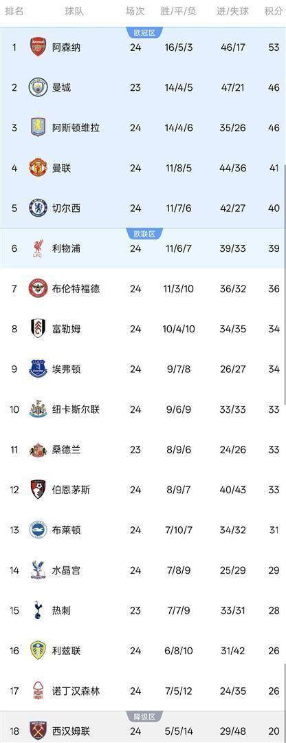 这一夜的比赛全部结束后,英超积分榜立刻更新。 阿森纳依然以53分领跑,曼城位居第二。 阿斯顿维拉输球后,积分停留在46分,未能超越同积48分的曼城,反而被拉开了2分的差距。
