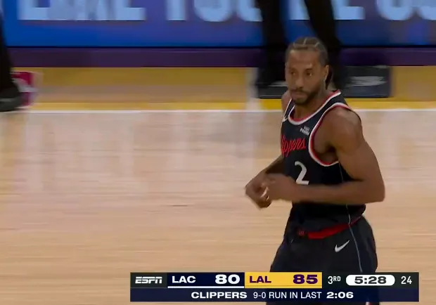 第三节比赛中,伦纳德抢断快攻上篮打进拿到25分,快船一波9-0落后湖人5分。