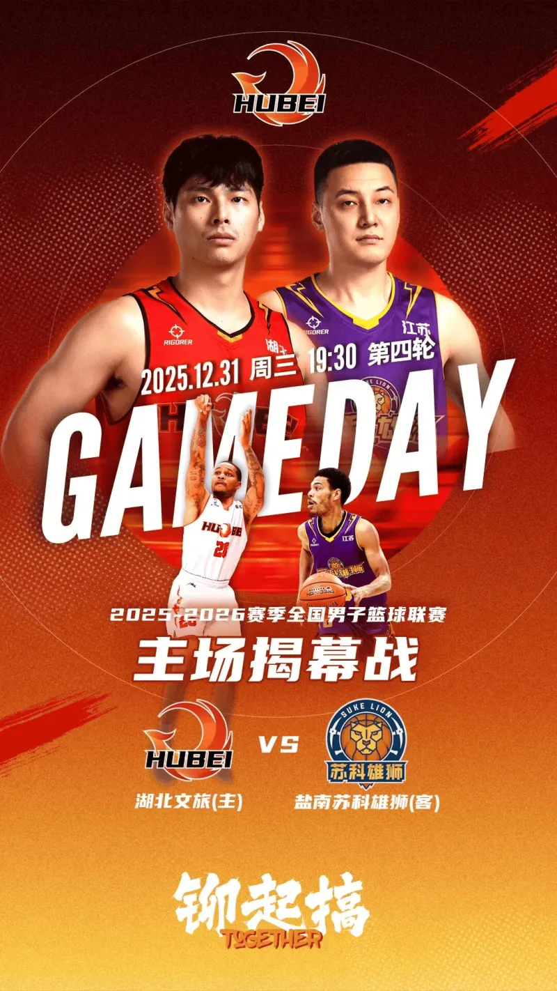 但我们本场的对手盐南苏科雄狮显然也是有备而来,尤其是近期状态出色的阿普肖,这对湖北文旅男篮内线群和防守体系,将是不小的考验。湖北文旅男篮的“第六人”们,新赛季首个主场,洪山体育馆早已热力满格,球迷的呐喊助威将成为球队最强大的后盾。跨年夜的洪山体育馆,灯光为荆楚之师点亮!让我们齐聚现场,高喊“湖北加油”,见证湖北文旅男篮以热血拼搏开启新赛季主场征程,用一场胜利书写荆楚篮球的崭新篇章!